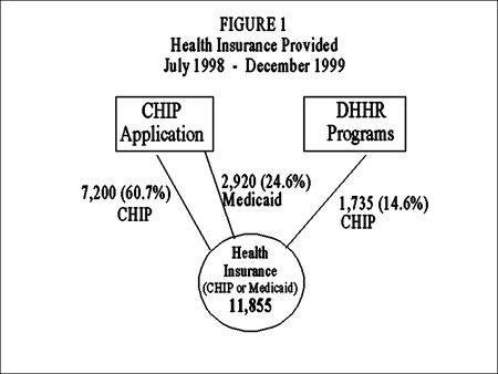 The magnitude of this potential slippage is shown in Figure 1. Between July of 1998 through December of 1999, 11,855 West Virginia children received either CHIP or Medicaid health insurance through the CHIP initiative. Of this number, 7,200 applied directly using the CHIP application and were found eligible for CHIP. However, 1,735 CHIP recipients did not actually apply to the CHIP program. Their parents applied to DHHR seeking public assistance of another sort, possibly Food Stamps, and they were found to be eligible for the CHIP program. These children were immediately enrolled in CHIP entirely due to the RAPIDS integrated computer system. Conversely, 2,920 children applied for CHIP but were not eligible because their income was too low, but they were eligible for Medicaid instead. They were immediately placed on Medicaid, and began receiving health benefits due to the RAPIDS integrated system.